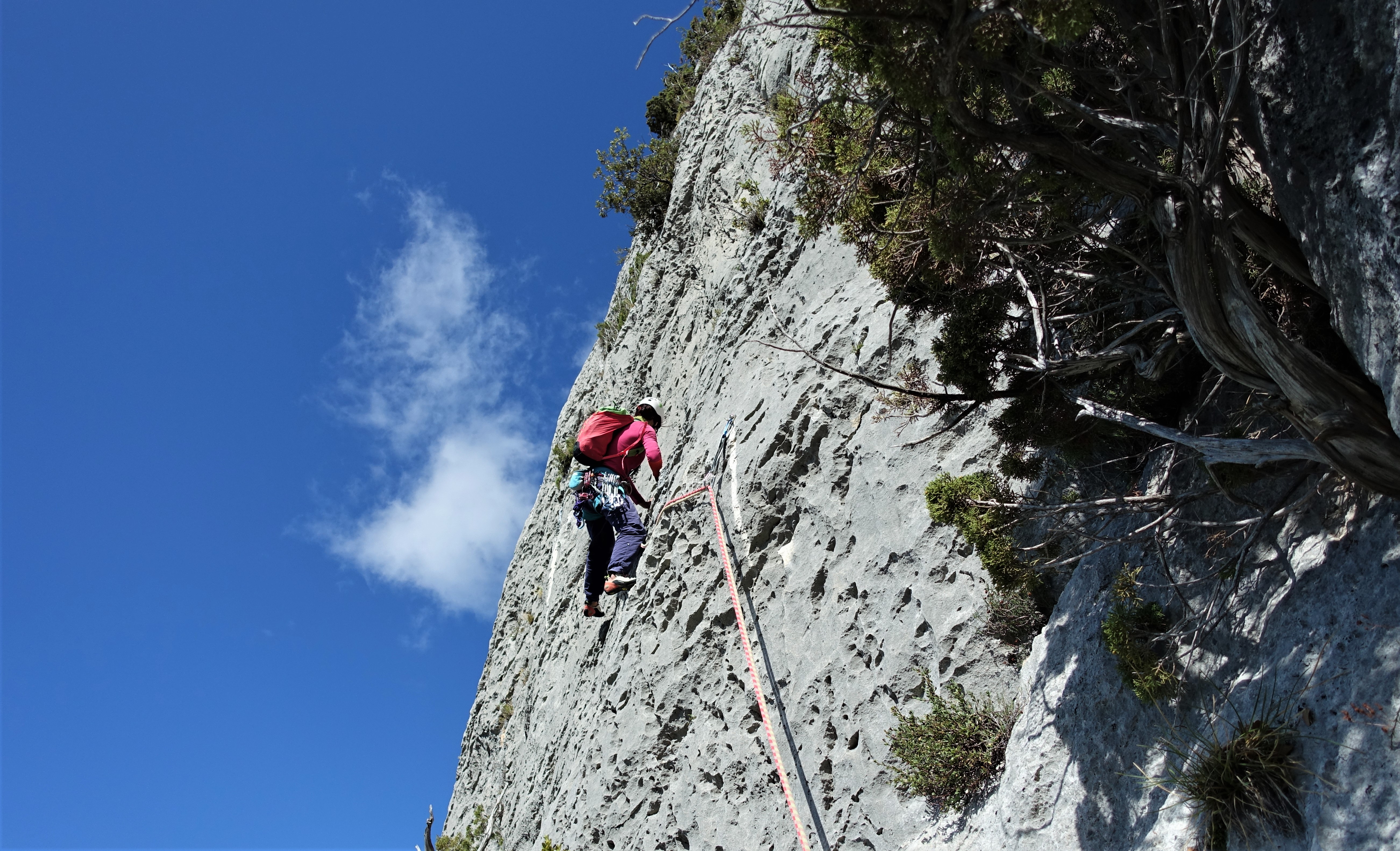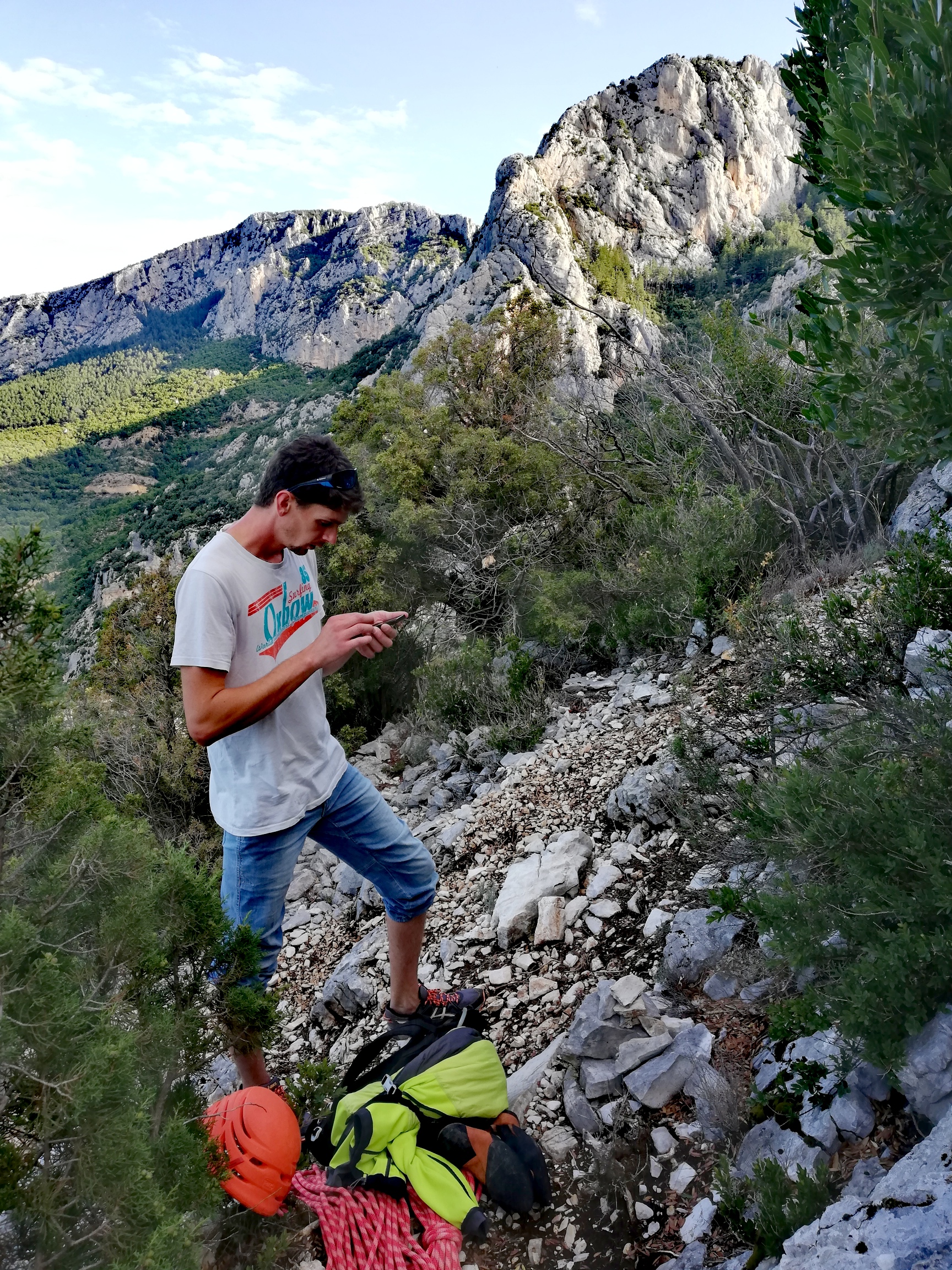 Seeing Verdon gorge in person really took my breath away… The gorge is gorgeous and I got exited for some nice lines. But first I had to meet my climbing partner Max, that I met on Facebook. Before going multipitching I usually get to know my climbing partner on sports routes, so I can get a better picture about how he belays and climbs. We went to an old sector and climbed a few routes and he was a calm and trustworthy French guy, so on the next day we went for a 160m long route called “Catalunya mon amour”. A great almost direct line of four pitches (yeah, the pitches are long, the first is over 40 meter long 6b, which definitely warms you up 🙂 ).